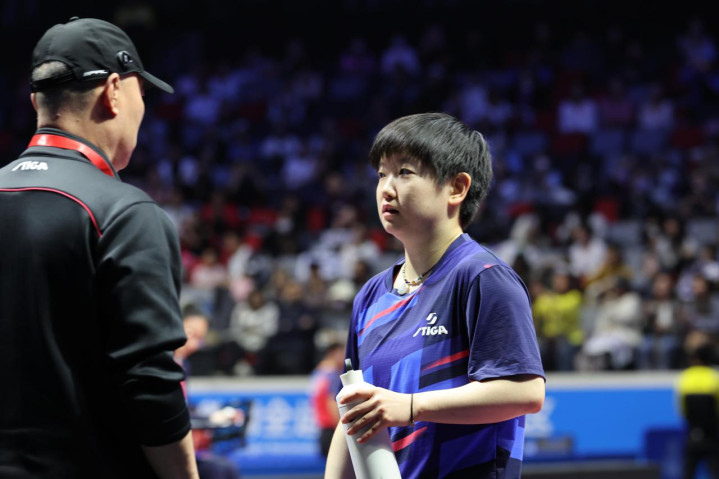 孙颖莎与教练交流。人民网记者胡雪蓉摄